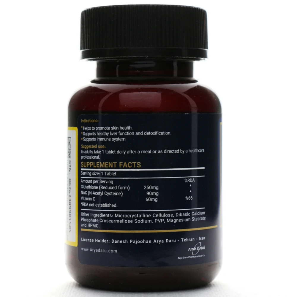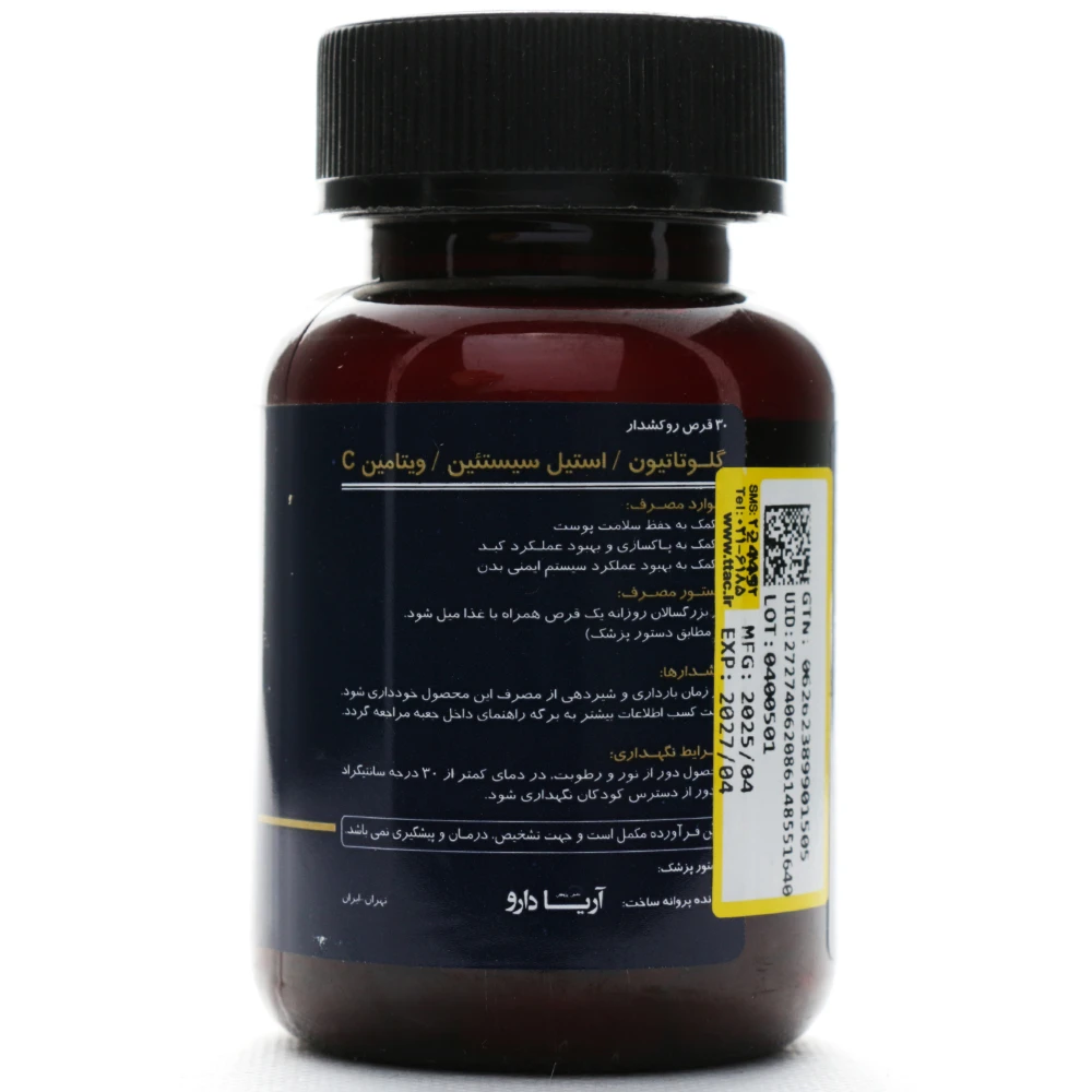 قرص گلوتاتیون، استیلسیستئین و ویتامین C آریا دارو با ترکیبات مؤثر و خاصیت آنتیاکسیدانی قوی، به پیشگیری از پیری پوست، کاهش لکهها و تیرگیهای پوستی و افزایش شفافیت و روشن شدن پوست کمک میکند.