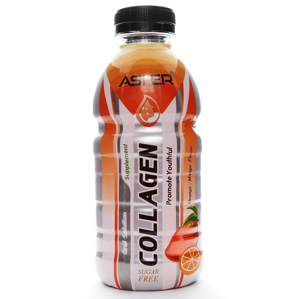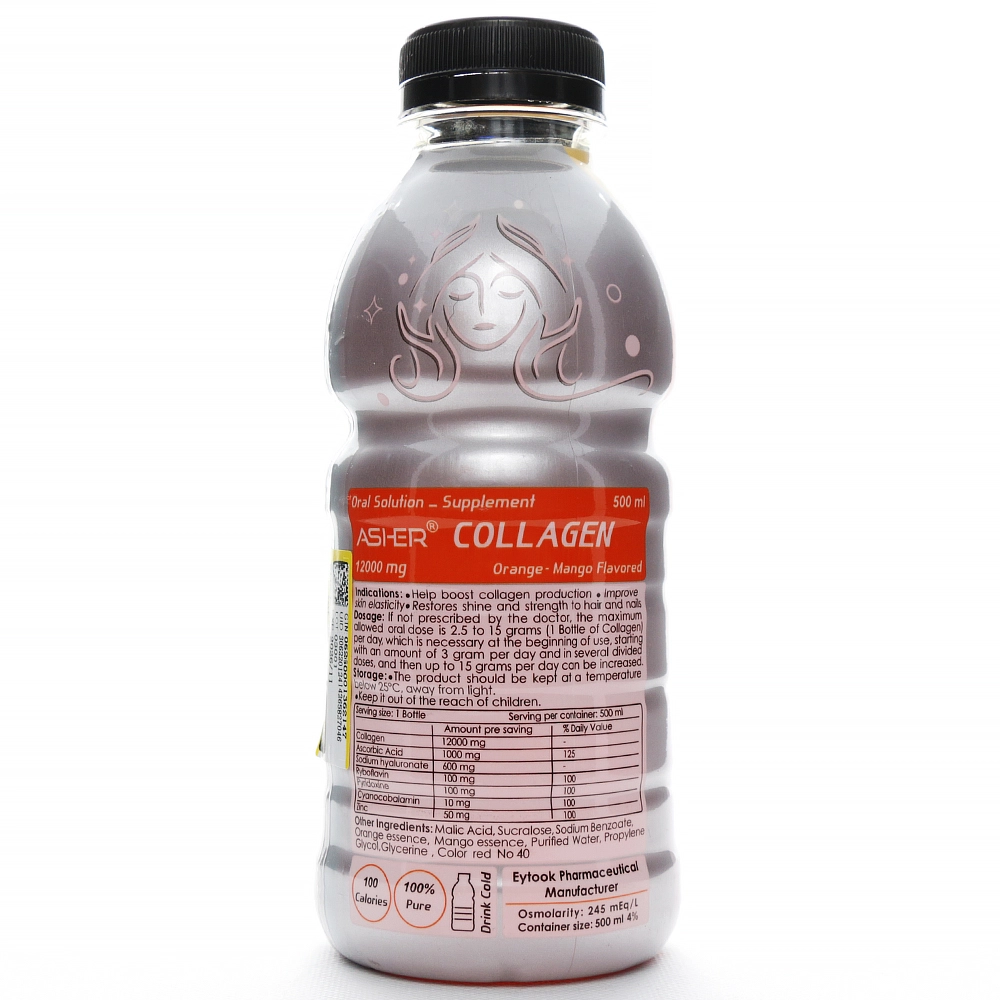 کلاژن آشر در بطریهای پلاستیکی ۵۰۰ میلیلیتری با طعم دلپذیر پرتقال و انبه عرضه میشود و هر وعده (۵۰۰ میلیلیتر) حاوی ۱۲ گرم کلاژن هیدرولیز شده، ۱۰۰۰ میلیگرم ویتامین سی، ۶۰۰ میلیگرم هیالورونیک اسید، ۵۰ میلیگرم زینک و ویتامینهای گروه B (ریبوفلاوین، پیریدوکسین و سیانوکوبالامین) است. این محصول فاقد شکر و قند افزوده بوده و با قابلیت جذب ۹۰٪، تا ۳ برابر بیشتر از قرصها و کپسولها جذب میشود.