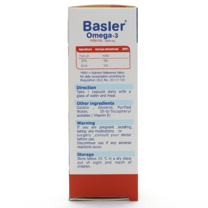 ماده مؤثر مقدار در هر کپسول روغن ماهی خالص ۱۰۰۰ میلیگرم EPA حدود ۱۸۰ میلیگرم DHA حدود ۱۲۰ میلیگرم سایر ترکیبات ژلاتین، گلیسرین، آب تصفیهشدهروش نگهداری کپسول امگا 3 باسلر