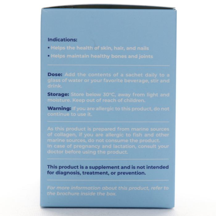 چون کلاژن این محصول از منشاء دریایی (ماهی) استخراج شده، افرادی که به ماهی یا صدف دریایی حساسیت دارند، باید از مصرف آن خودداری کنند یا قبل از مصرف حتماً با پزشک مشورت کنند.