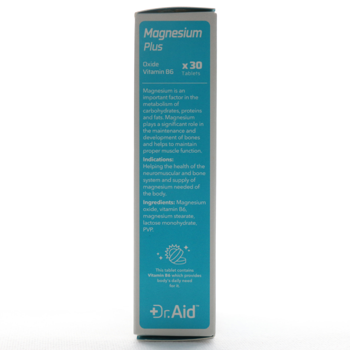 منیزیم یکی از مهمترین مواد معدنی است که بدن برای عملکرد صحیح بسیاری از فرآیندهای زیستی به آن نیاز دارد. قرص منیزیم پلاس دکتر اید با تأمین ۶۵٪ نیاز روزانه منیزیم، کمک میکند تا کمبود این ماده مهم جبران شود و بدن بتواند عملکرد بهتری داشته باشد. ویتامین B6 موجود در این مکمل نیز به جذب بهتر منیزیم و فعالیتهای متابولیکی بدن کمک میکند.