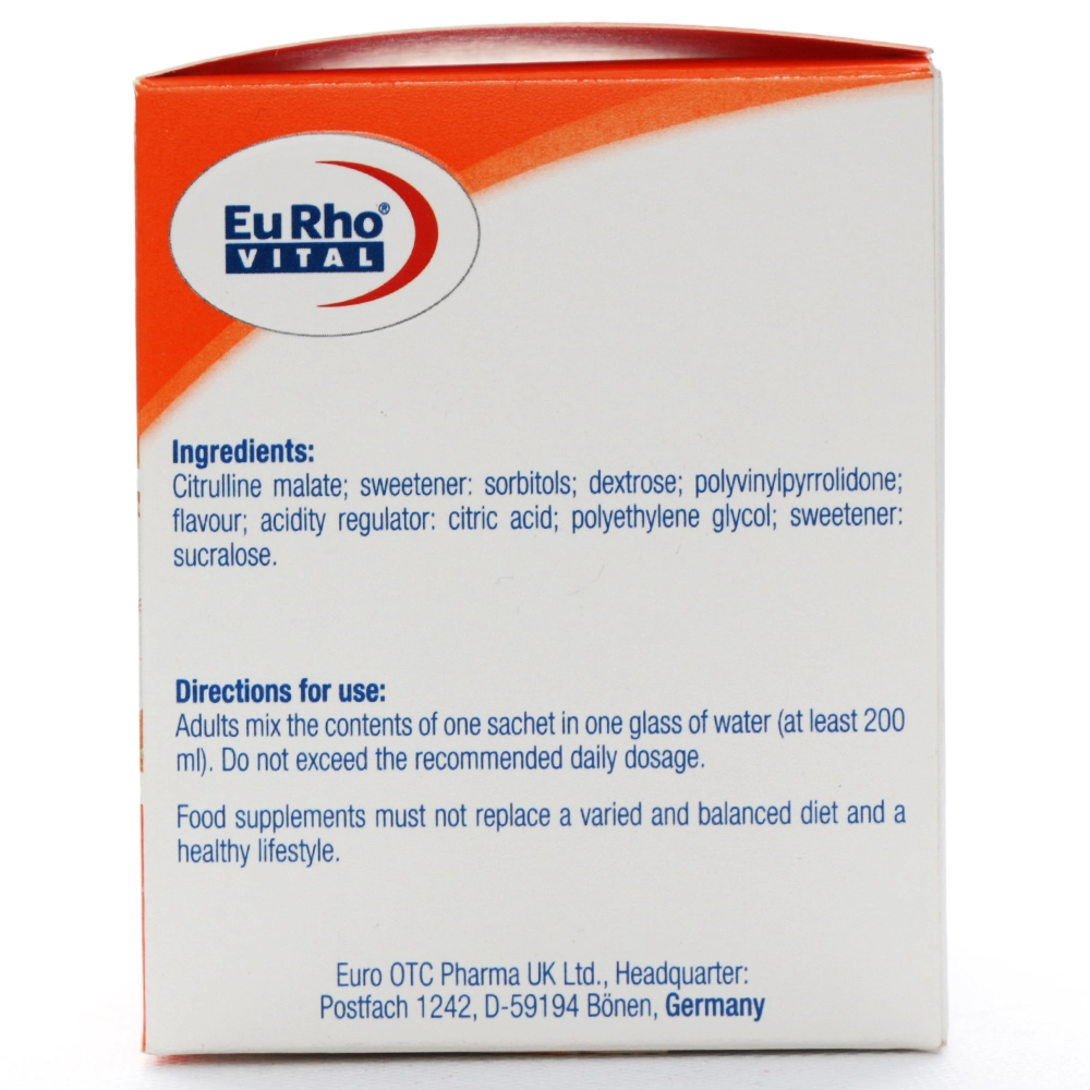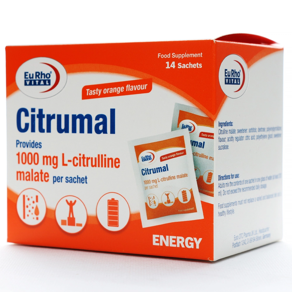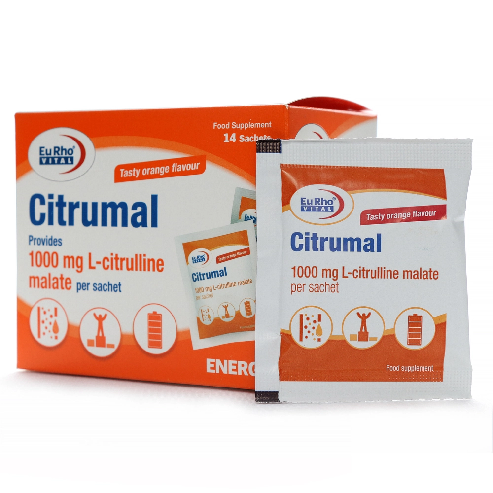 ساشه سیترومال یوروویتال، یک مکمل غذایی باکیفیت حاوی ۱۰۰۰ میلیگرم ال-سیترولین مالات خالص در هر ساشه است، که به منظور ارتقای عملکرد ورزشی، افزایش انرژی و کاهش فشار خون طراحی شده است.
