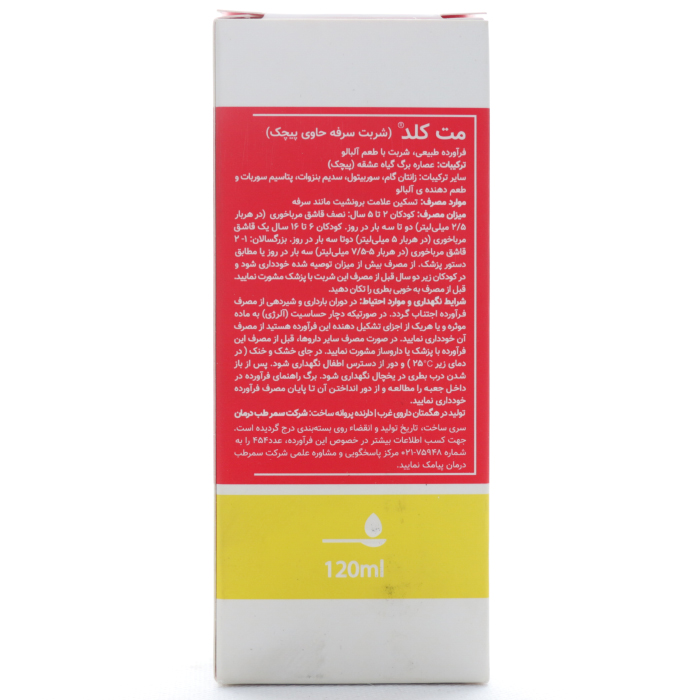 طریقه مصرف شربت مت کلد طبق دستورالعمل شرکت سازنده به شرح زیر است: کودکان 2 تا 5 سال: دو تا سه بار در روز و هر بار به میزان نصف قاشق مرباخوری (2.5 میلی لیتر) کودکان 6 تا 16 سال: دو تا سه بار در روز و هر بار به میزان یک قاشق مرباخوری (5 میلی لیتر) بزرگسالان: سه بار در روز و هر بار به میزان 1 تا 2 قاشق مرباخوری (5-7.5 میلی لیتر) در صورتی که پزشک این محصول را تجویز نموده است، طبق دستور ایشان مصرف شود. پیش از مصرف بطری را خوب تکان دهید.ترکیبات شربت مت کلد: