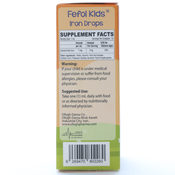 قطره آهن ففول کیدز اینترافارم، مکملی موثر و خوشطعم با طعم پرتقالی است که به طور ویژه برای کودکان بالای ۶ ماه طراحی شده و با بهره گیری از آهن لیپوزومال با جذب بالا، به پیشگیری از کم خونی، بهبود تمرکز، تقویت سیستم ایمنی و رشد ذهنی و جسمی کودک کمک میکند. این قطره با تأمین نیاز روزانه بدن به آهن، از بروز علائمی مانند بی حالی، بیاشتهایی و اختلال در یادگیری جلوگیری کرده و نقش مؤثری در رشد سالم مو، ناخن و افزایش انرژی روزانه کودکان ایفا میکند.