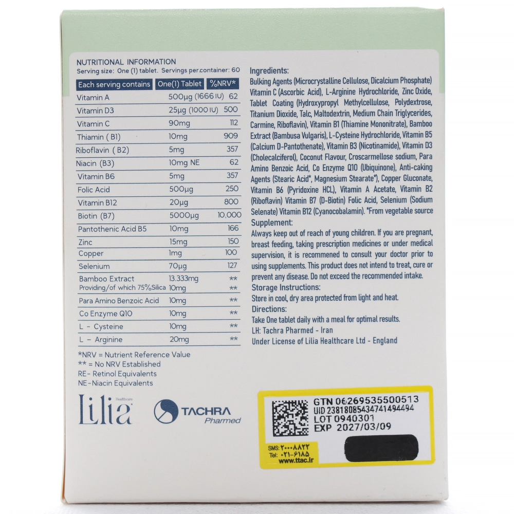 محصول تحت لیسانس لیلیا هلث کر انگلستان در ایران تولید شده و توسط شرکت تچرا فارمد عرضه میشود. هر بسته شامل ۶۰ قرص روکشدار با طعم نارگیل است و برای افرادی با موهای نازک یا شکننده، ناخنهای ضعیف، کمبود ریزمغذیها یا سبک زندگی پرمشغله مناسب است.