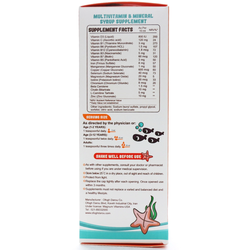 علاوه بر این، این شربت غنی از مواد معدنی کلیدی نظیر زینک، آهن، سلنیوم، منگنز، مس، منیزیم، ید و کروم است و با افزودن ترکیبات حمایتی مانند کولین و ال-کارنیتین، حمایت همهجانبهای از رشد، ایمنی و سلامت کلی بدن ارائه میدهد.