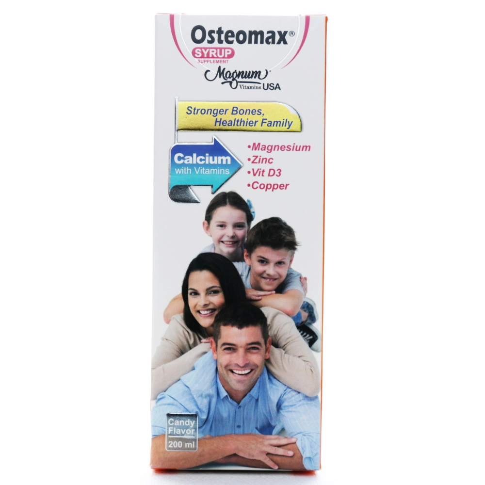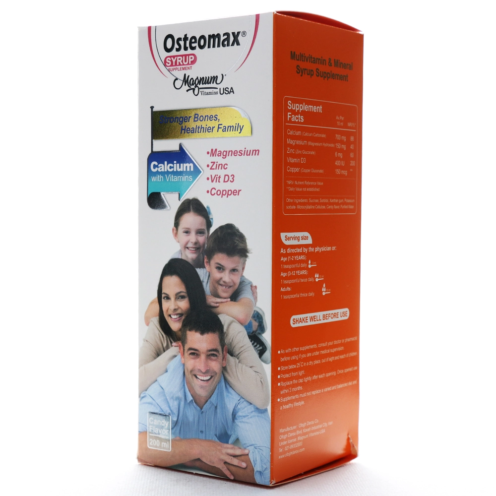 فرم شربت با طعم دلپذیر آبنبات، مصرف را برای سنین مختلف آسان نموده و به ویژه برای کودکان در دوره رشد، سالمندان و افرادی که در بلع قرص مشکل دارند، گزینهای مناسب به شمار میرود. شربت استئومکس تحت لیسانس مگنوم ویتامینز آمریکا بوده و با پروانه داروسازی افق تولید دارو پارس در ایران، در حجم ۲۰۰ میلیلیتر تولید شده است.