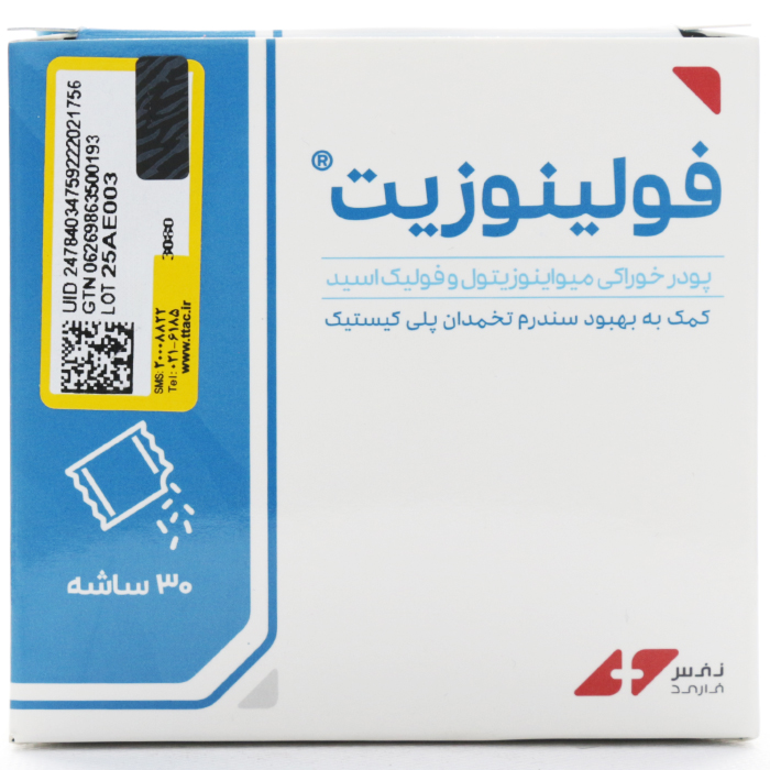 هر ساشه از این محصول حاوی ۲۰۰۰ میلیگرم میواینوزیتول و ۰.۲ میلیگرم (۲۰۰ میکروگرم) فولیک اسید میباشد.ترکیب این دو ماده ضمن کمک به تأمین نیاز بدن در شرایط کمبود، در کاهش علائم سندرم تخمدان پلیکیستیک (PCOS) و بهبود عملکرد هورمونی و تخمکگذاری نقش دارد. پودر فولینوزیت در بستهبندیهای ۳۰ عددی ساشه، توسط شرکت نفس زیست فارمد در ایران تولید و عرضه میشود.