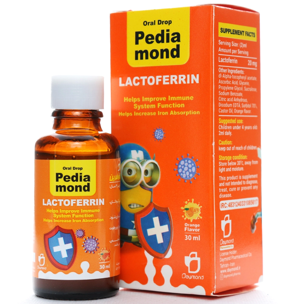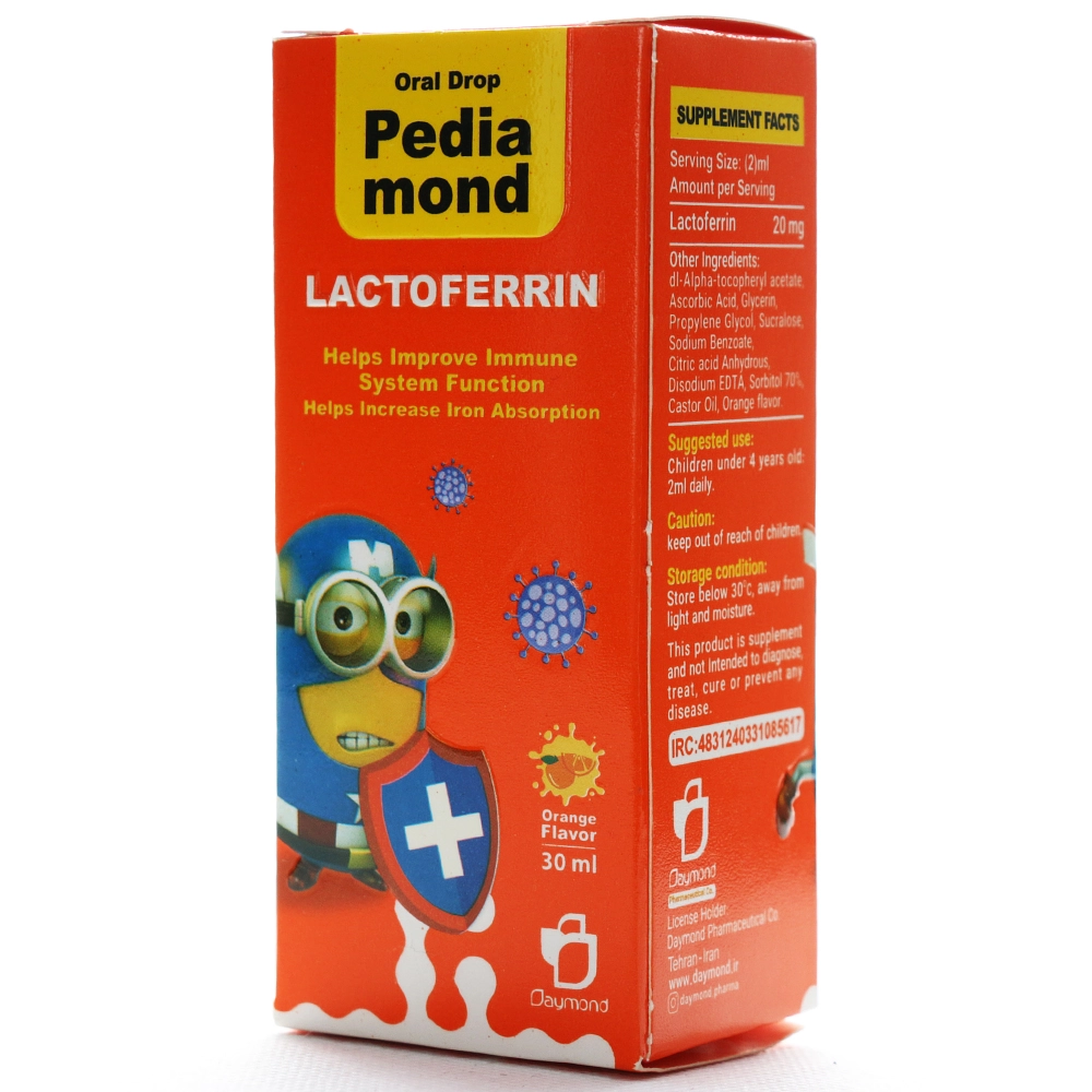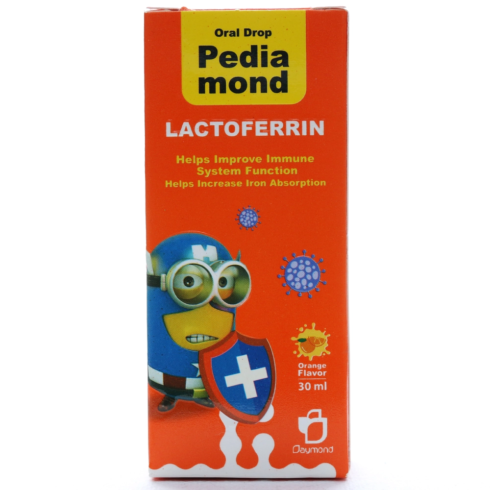 قطره لاکتوفرین پدیاموند، یک مکمل تغذیهای به شکل قطره خوراکی است که برای تقویت سیستم ایمنی کودکان زیر ۴ سال طراحی شده است. هر ۲ میلیلیتر از این قطره حاوی ۲۰ میلیگرم لاکتوفرین است و علاوه بر حمایت از عملکرد سیستم دفاعی بدن، به بهبود جذب آهن نیز کمک میکند. این محصول با طعم پرتقال و در بطریهای شیشهای ۳۰ میلیلیتری با قطرهچکان عرضه میشود و توسط شرکت طب طبیعی سبز دیموند در ایران تولید میگردد.
