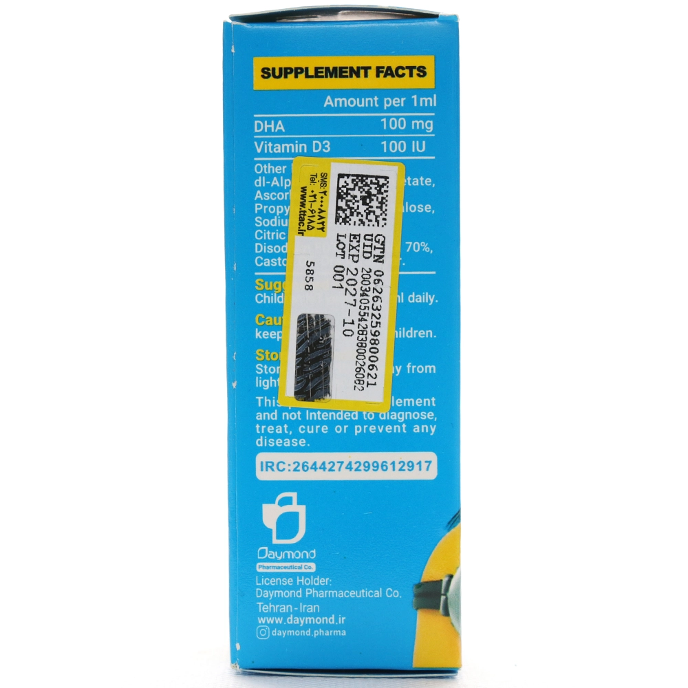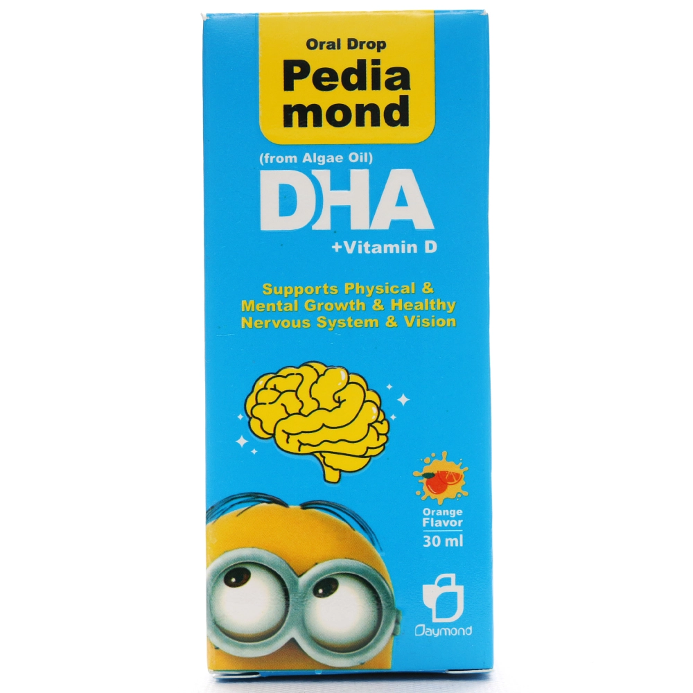 قطره دی اچ ای پدیاموند حاوی 100 میلی گرم DHA و 100 واحد ویتامین د3 بوده که به تقویت سیستم ایمنی و حمایت از رشد مغزی و عملکرد شناختی کودکان کمک میکند.
