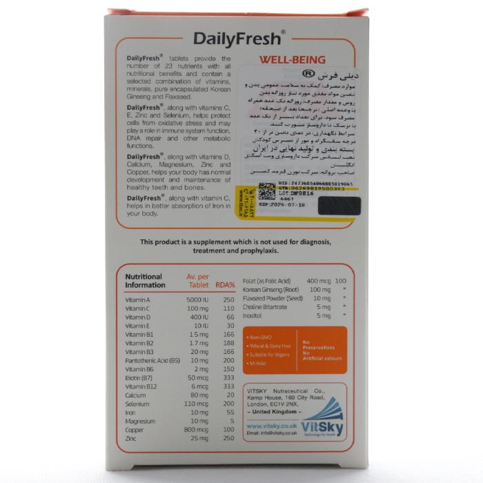 قرص دیلی فرش ویت اسکای ترکیبی کامل از ۲۳ نوع ویتامین، مواد معدنی ضروری و جینسینگ کرهای است که به تقویت سلامت عمومی بدن کمک میکند. این محصول با داشتن ویتامینهایی چون A، C، D، E و مینرالهایی مانند آهن، کلسیم و روی، در تقویت سیستم ایمنی، افزایش انرژی، پیشگیری از کم خونی، سلامت استخوانها و محافظت بدن در برابر رادیکالهای آزاد نقش مؤثری دارد.قرص دیلی فرش برای چیست