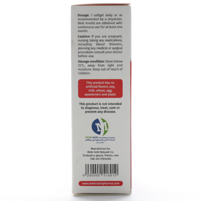کپسول امگا 5 زراوش عاری از طعم دهندههای مصنوعی، شیرین کنندههای شیمیایی، سویا، فرآوردههای شیری، گندم، تخم مرغ و مخمر