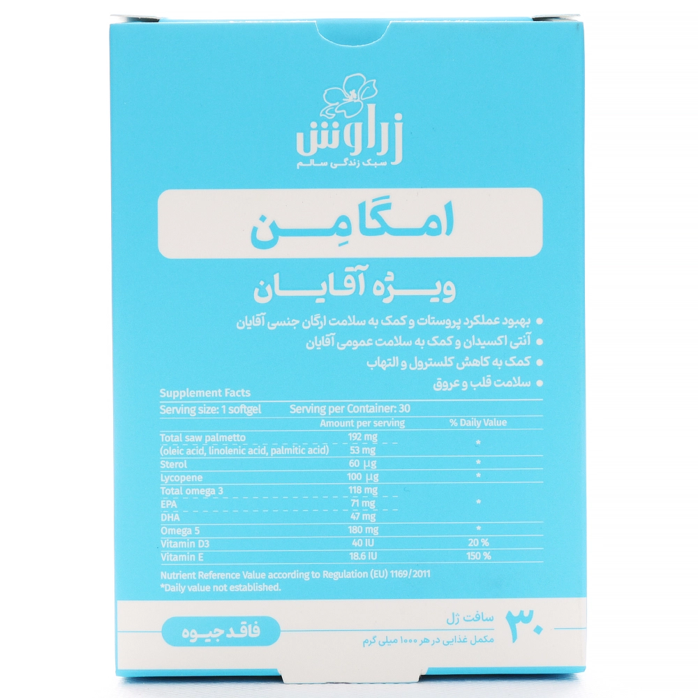 کپسول امگا من زراوش، یک مکمل مخصوص آقایان بوده که حاوی امگا ۳ و امگا 5 و دیگر اسیدهای چرب ضروری است که در بهبود عملکرد فیزیولوژیک مردان تاثیر بسیار خوبی دارد.