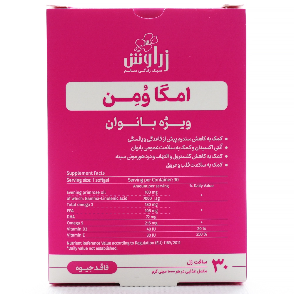 کپسول امگا ومن زراوش، یک مکمل تخصصی و جامع برای سلامت بانوان در تمام مراحل زندگی است که با ترکیبی هدفمند از اسیدهای چرب ضروری، ویتامینهای D3 و E و ریزمغذیهای مؤثر فرموله شده است. این محصول به کاهش علائم سندرم پیش از قاعدگی (PMS) و یائسگی (مانند گرگرفتگی، درد سینه)، حفظ سلامت قلبی-عروقی، کاهش سطح کلسترول و التهاب، ارائه محافظت آنتیاکسیدانی و کمک به پیشگیری از سرطانهای وابسته به هورمون مانند سرطان سینه و کولون کمک میکند. فاقد جیوه و مناسب برای مصرف روزانه می باشد.